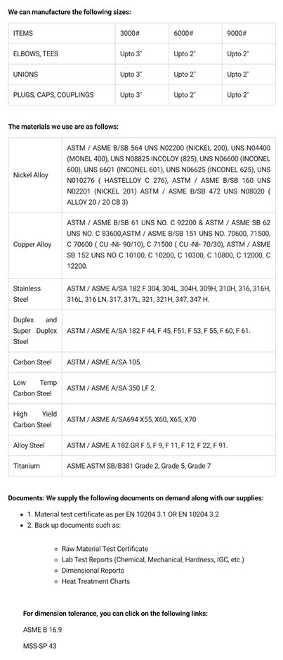 We manufacture forged fittings in threaded (NPT, BSP, BSPT) as well as socket weld types